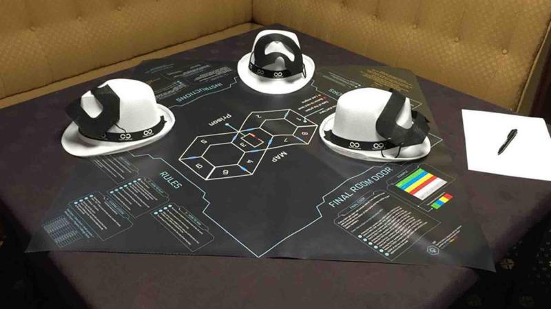 One team member at a time wears the VR headset to describe the virtual world, while the teammates in the real world have the solutions, comprised of set of lock modules, which open the doors of different rooms using the White Hats Guide Book. Just when they think they are done, they are pushed to a second level, and must go through the same rooms with more complicated lock systems. The game’s objective is to create competition between teams, with a main screen showcasing the evolution of multiple teams in one game session.